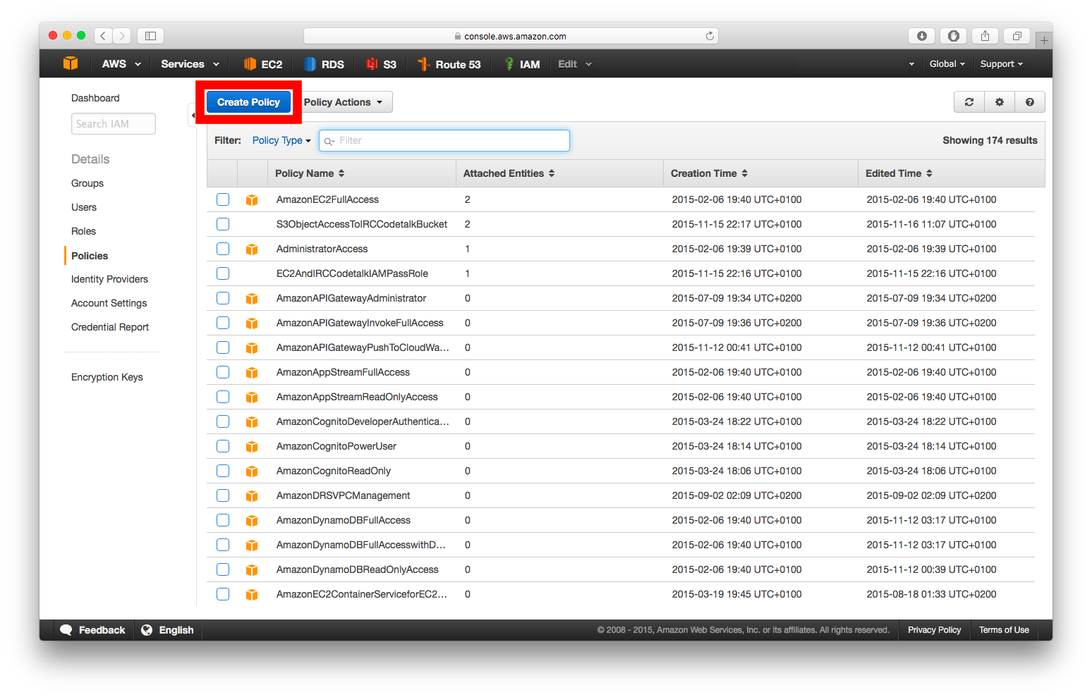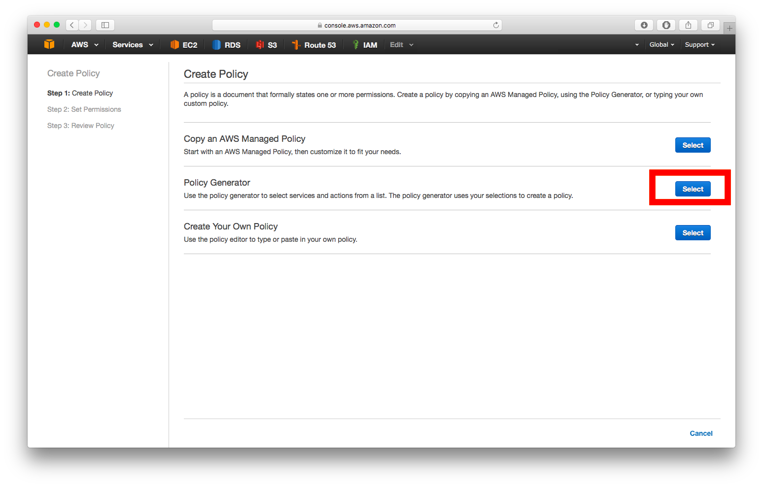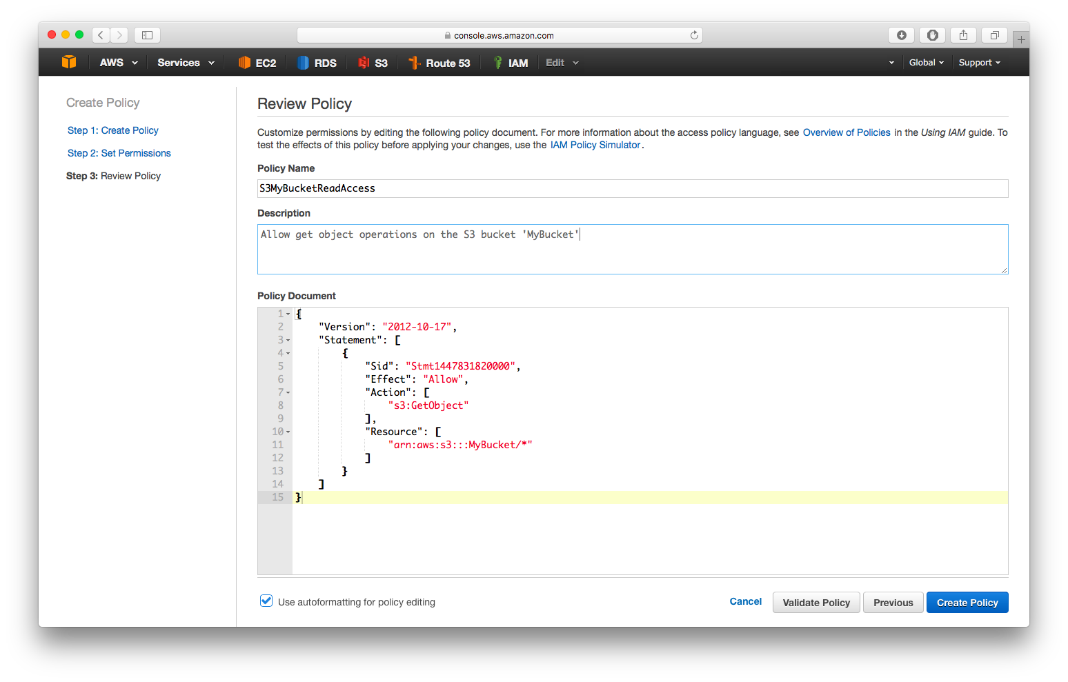 Here you just need to input a name, description and the policy document itself. You can either use the generator as a basis for this document or craft your own. The following is the one generated from the policy generator which can be directly used here.