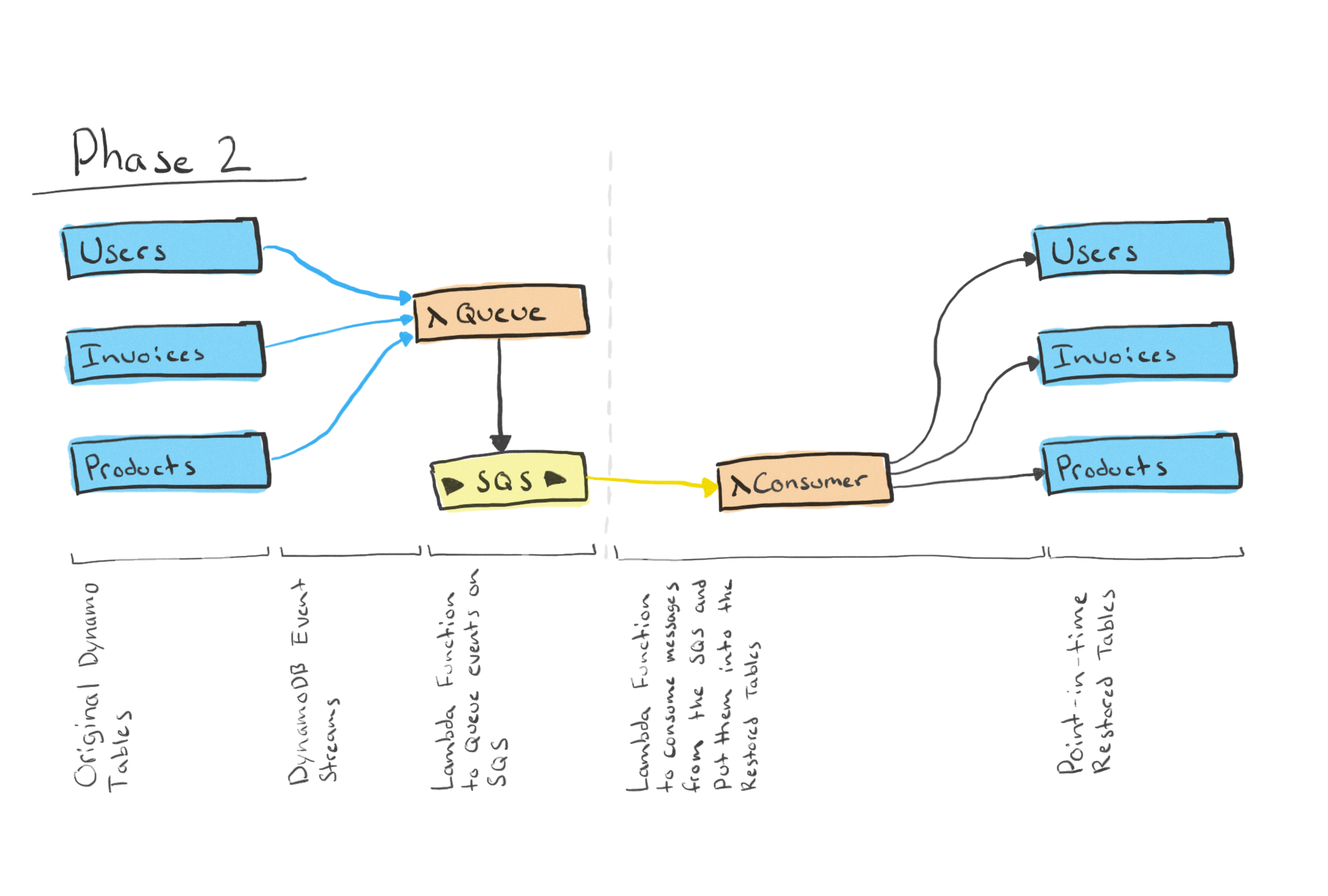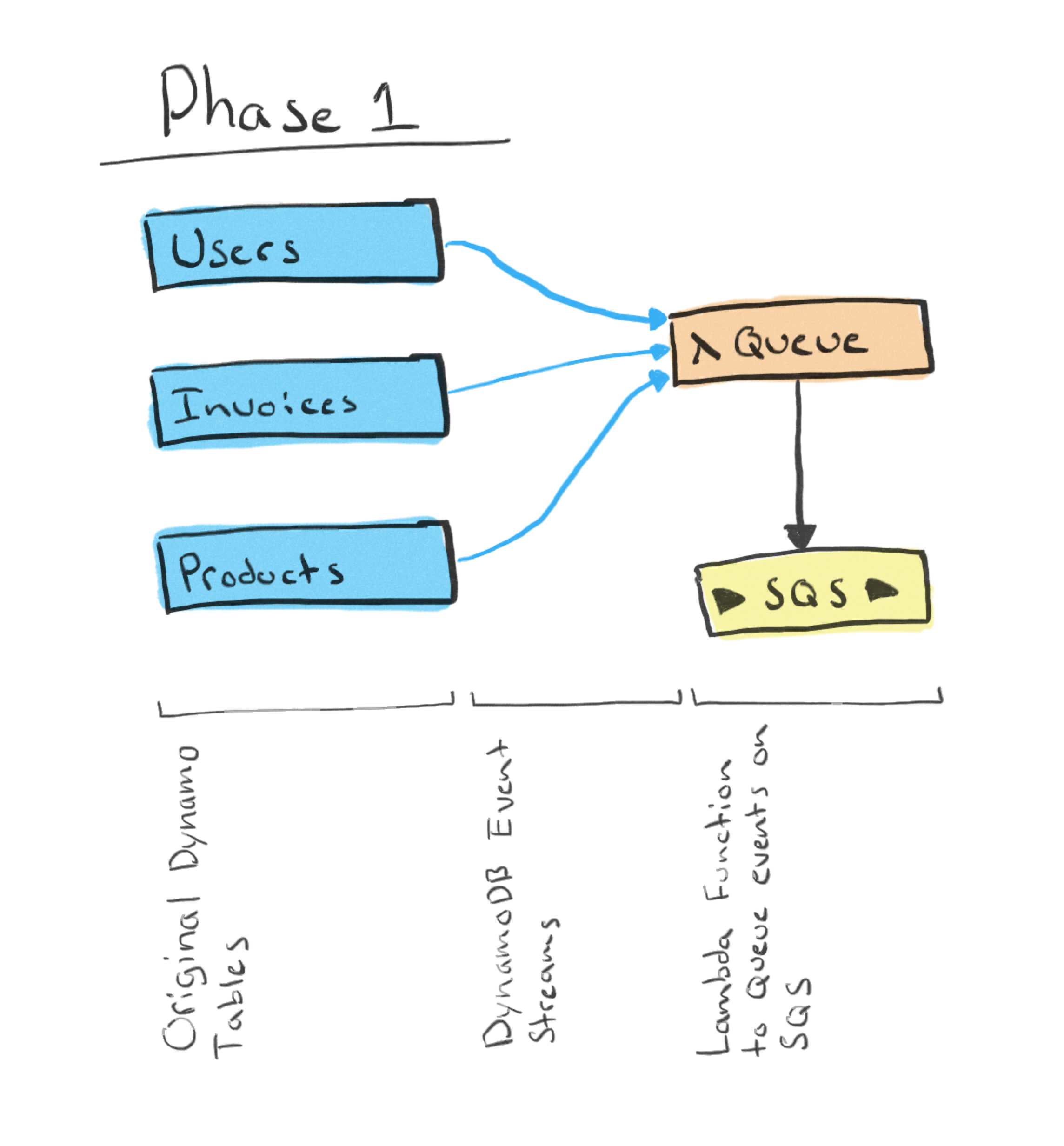 Pointing the API to the new DynamoDB tables means that no more operations are done on the old tables, and thus no further events are put on the SQS. This had the effect that there was no rush to clean up the two Lambdas and SQS queue since they would simply not be performing any actions anymore.